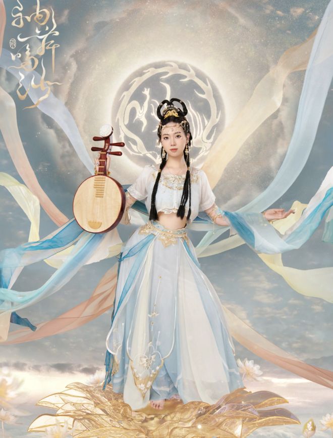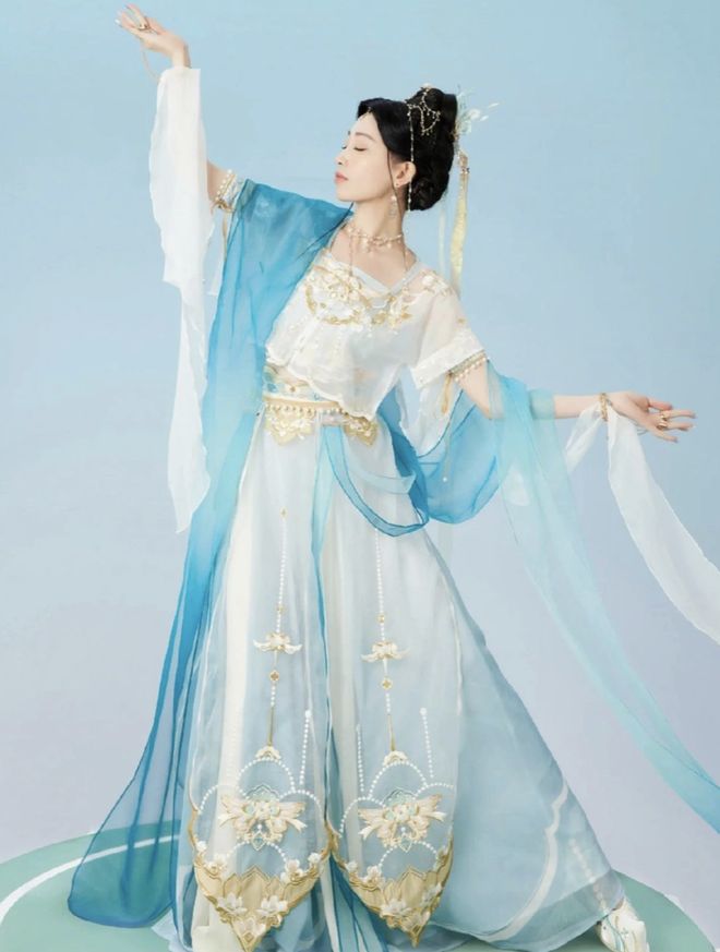 与十三余的联名款——敦煌飞天,在坦领上有各种敦煌壁画中的纹样刺绣,防臂钏的配饰也可以用来固定披帛,内搭没有用常用的圆领衫,而是创新了新的现代刺绣吊带,极尽得表达了华丽风格,仿佛下一秒就会入画飞天。