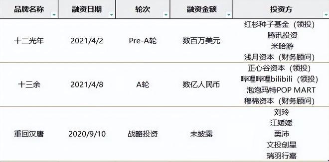 2021年4月8日,汉服国风品牌十三余关联公司杭州达哉文化有限公司获得A轮过亿元融资,投资方为正心谷资本、哔哩哔哩和泡泡玛特