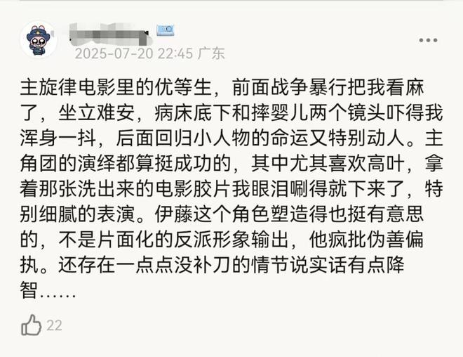 前面的战争戏,吓得我浑身一抖,后面回归小人物的命运,又特别动人。主角团的演绎都挺成功,尤其喜欢高叶,拿着那张洗出来的电影胶片,我眼泪唰得就下来了,特别细腻的表演。