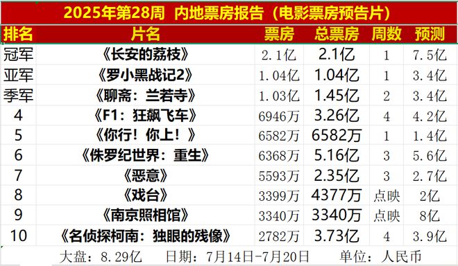 2025年第28周内地票房排行榜新鲜出炉,大盘共计斩获8.29亿,环比第27周增长了35%,主要是本周档期迎来了四部新片开画。